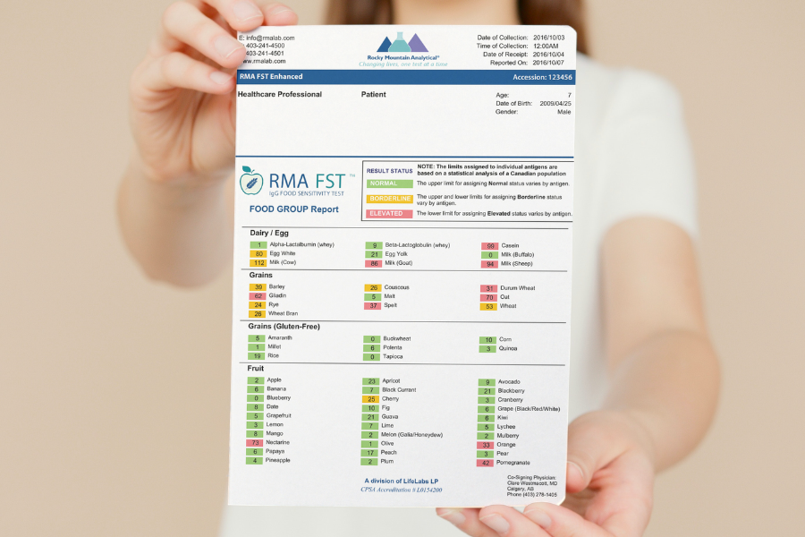 “The test we do at HealthOne is the RMT FSA igT Food Sensitivity Test by Rocky Mountain Analytical,” says Saira, “And there are different panels we can do. One panel tests for 222 different foods, and there are also vegetarian and vegan panels that exclude certain animal products.”